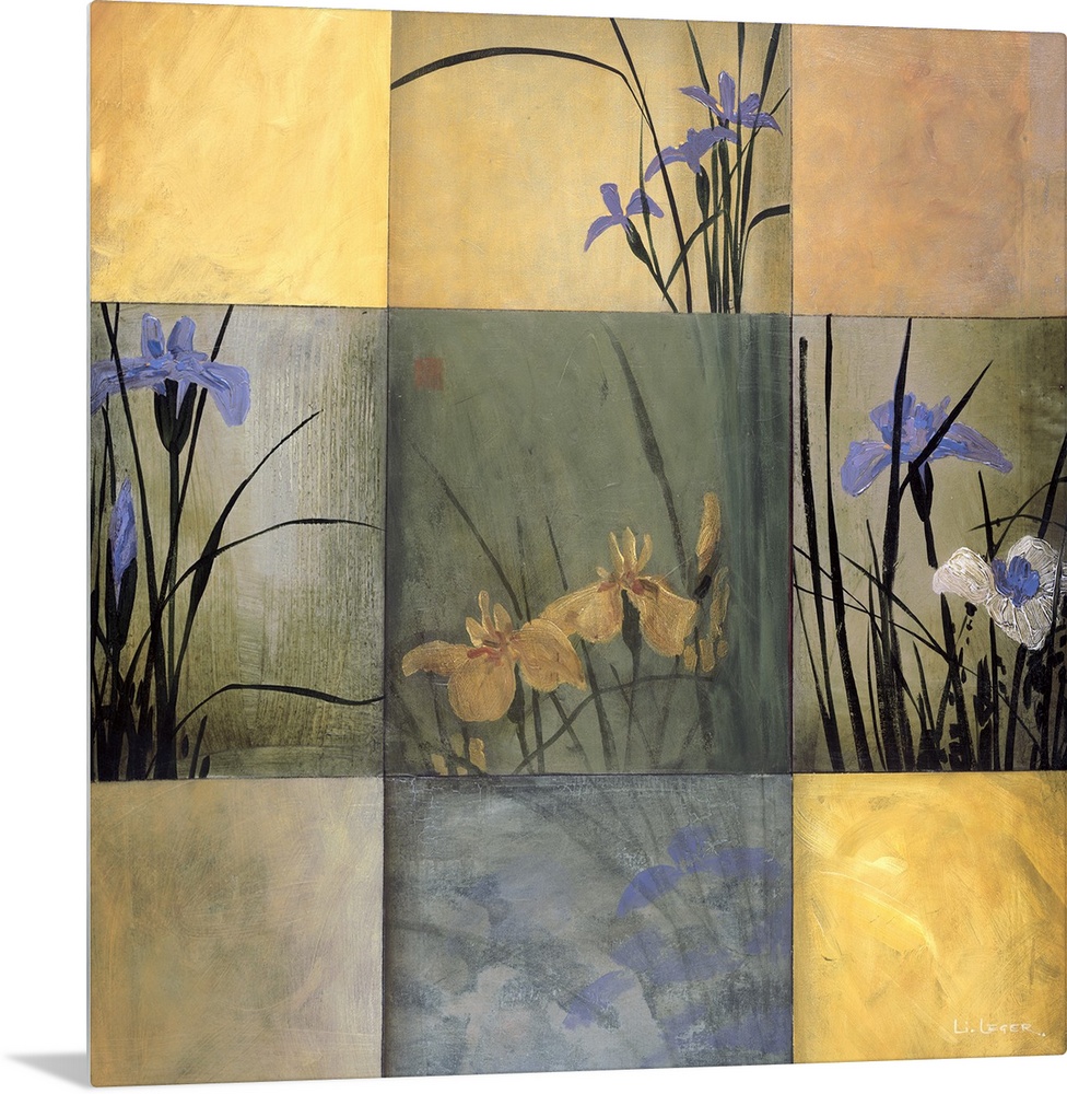 <p>A contemporary painting of irises in a nine square grid design.</p>