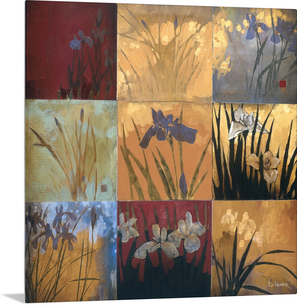 <p>Square painting of nine squares of irises in different colors and views.</p>