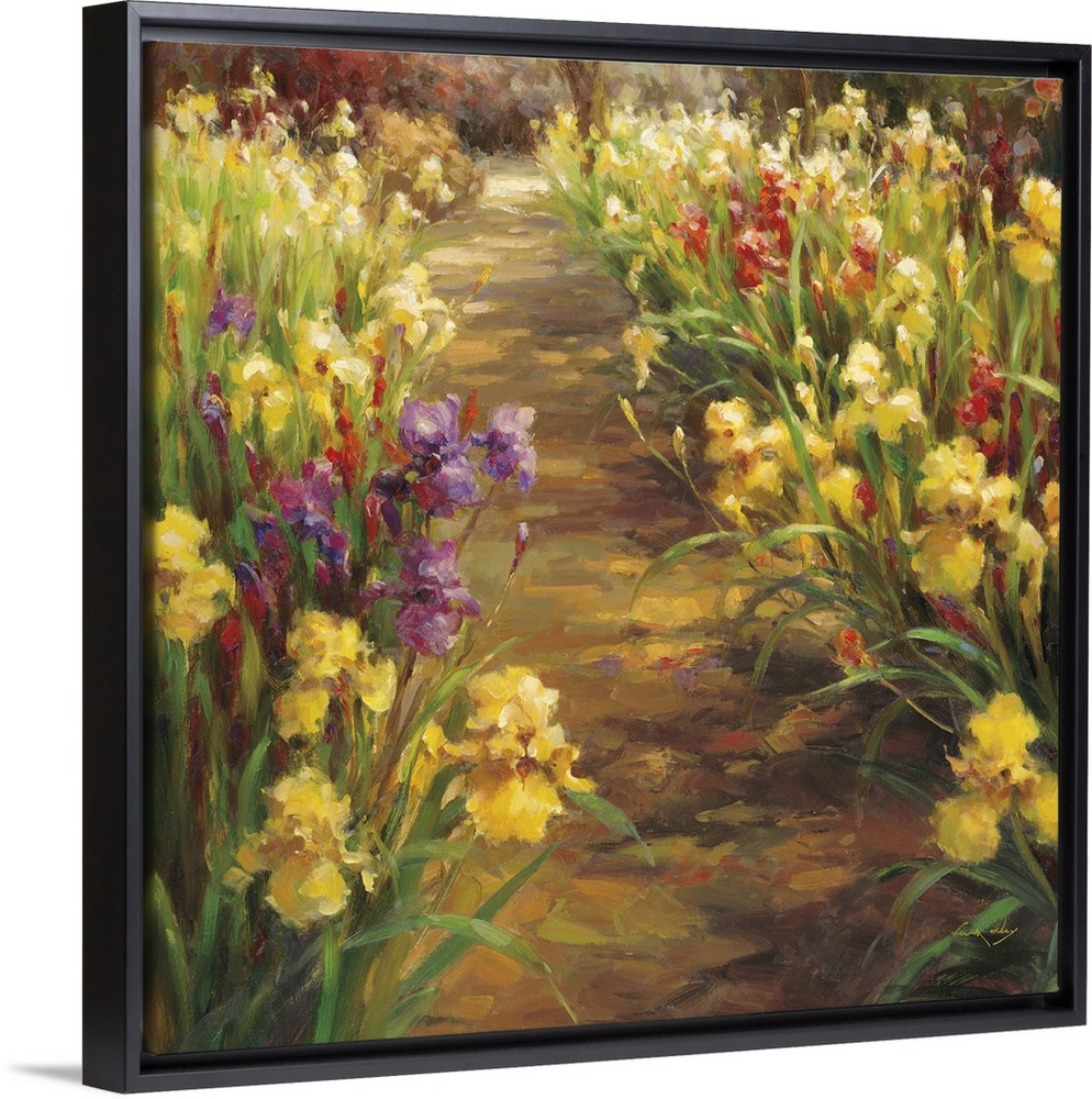 <p>Contemporary painting of a pathway in a garden surrounded by colorful irises.</p>