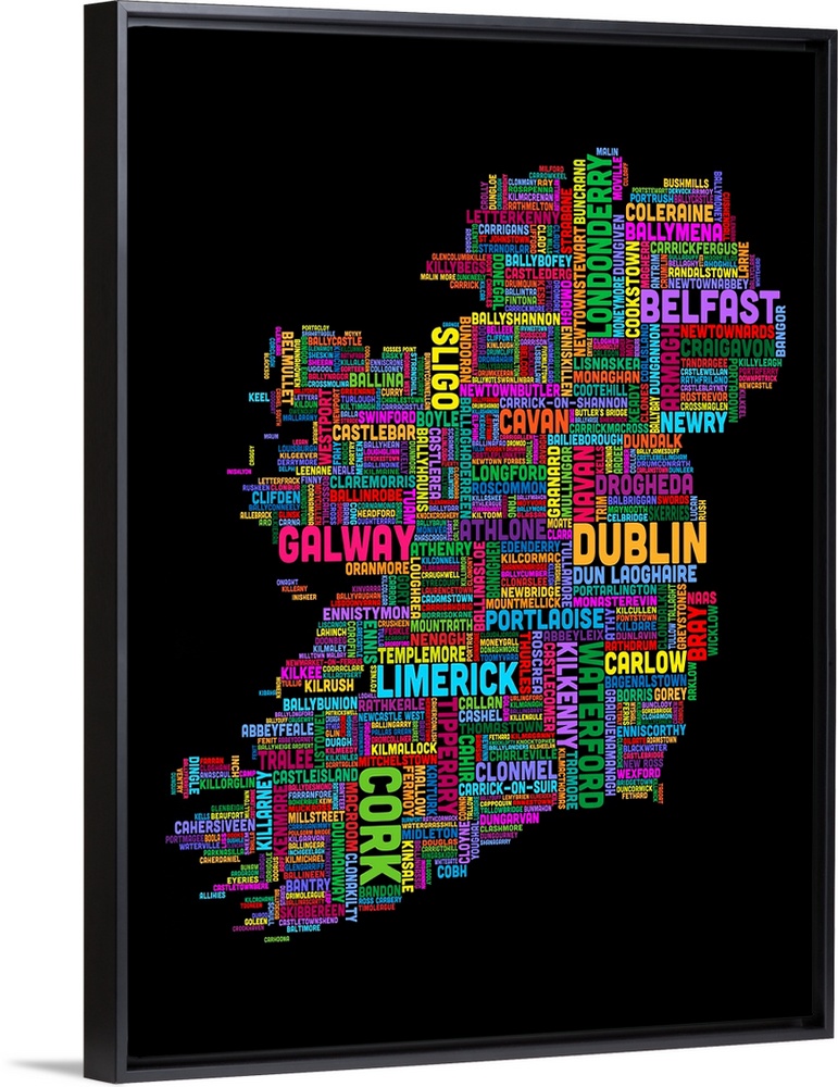 Irish Cities Text Map, Multicolor on Black