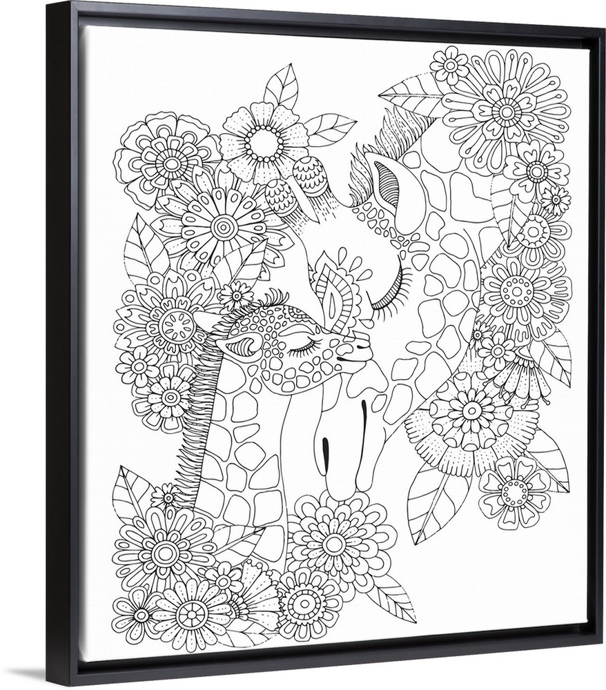 <p>Uniquely designed black and white line art of a mother and baby giraffe snuggling with flowers all around them.</p>