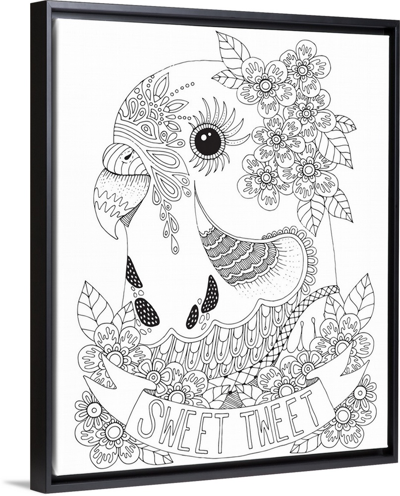<p>Black and white line art of a parakeet surrounded by flowers with a banner that has the phrase "Sweet Tweet" on it.</p>
