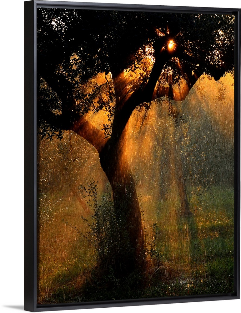 <p>Raindrops falling through a tree in a summer storm, illuminated by the light of the setting sun.</p>