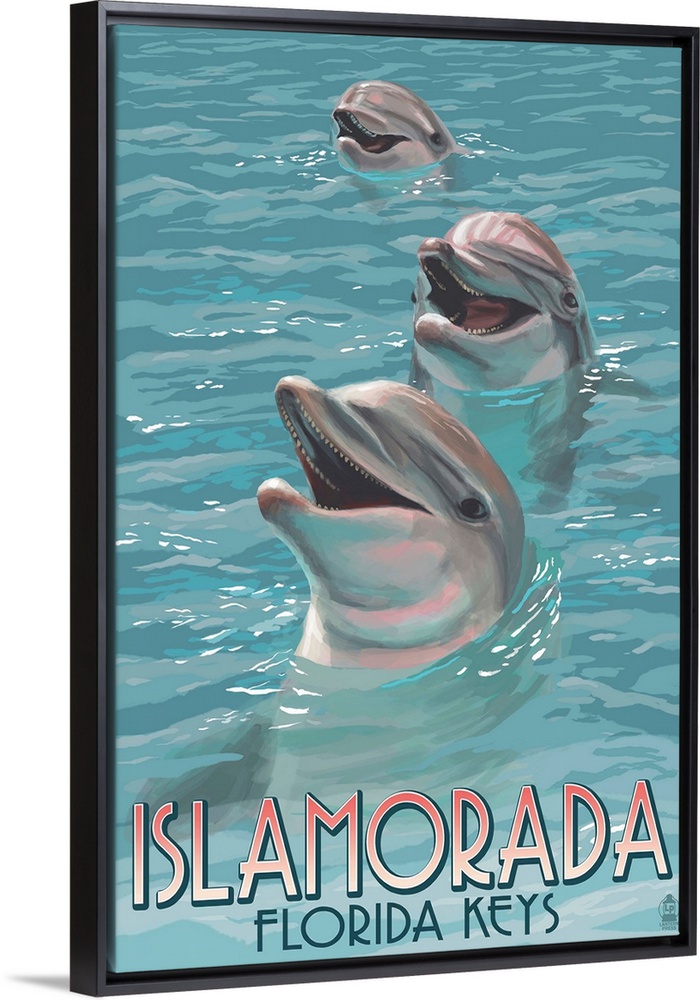 <p>A stylized art poster of three bottle nose dolphins peering out of the water.</p>