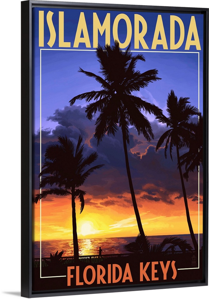 <p>A retro stylized art poster of three silhouetted palm trees on a beach at a sunset that illuminates billowing dramatic clouds.</p>