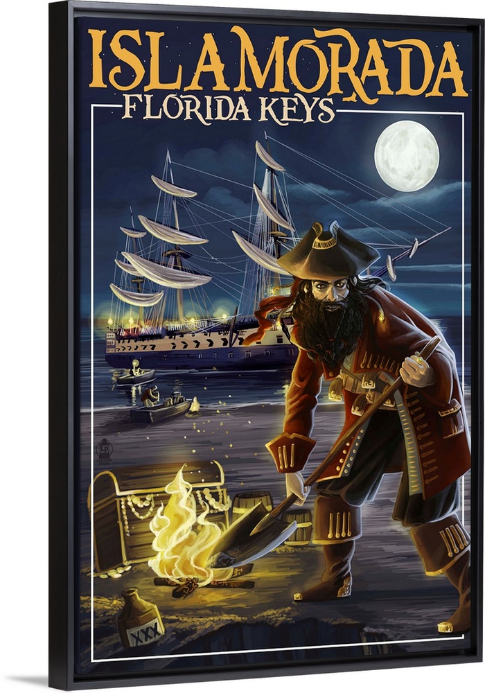 <p>Stylized art poster showing a pirate digging for gold and a tall ship in the background.</p>