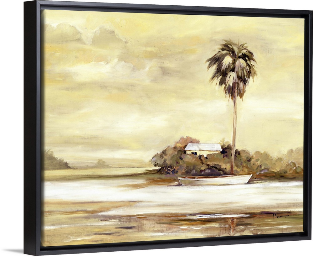<p>Sepia-toned painting of a tall palm tree rising over a sandy beach.</p>