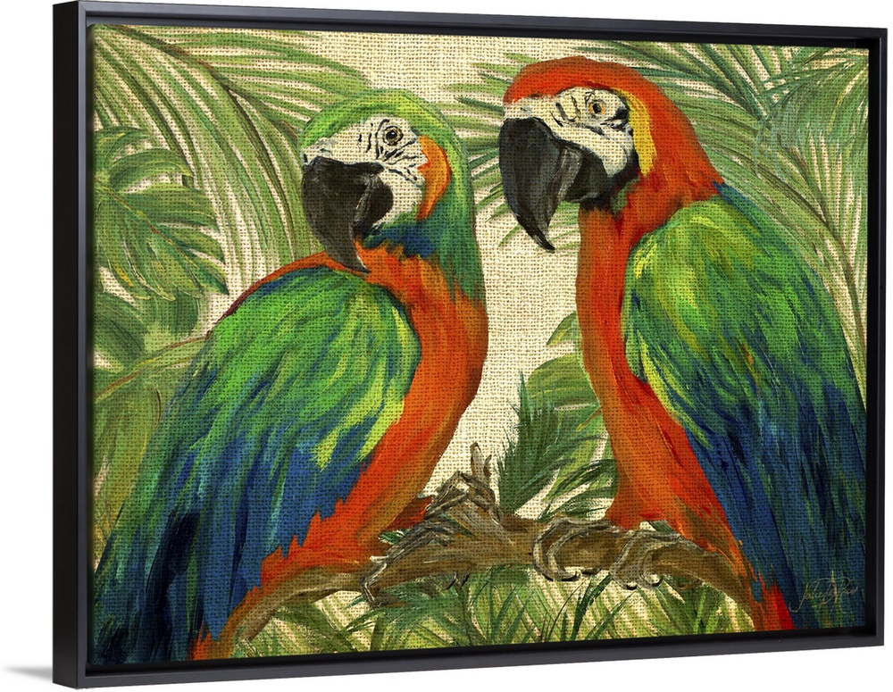 <p>Contemporary painting of two parrots on a branch surrounded by lush green trees and plants on a burlap textured background.</p>