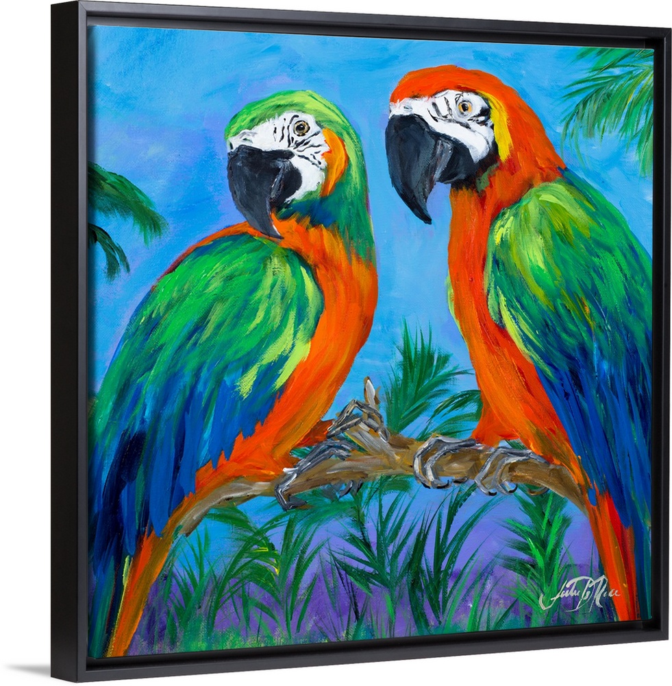 <p>Square contemporary painting of two parrots on a branch surrounded by lush green trees and plants.</p>