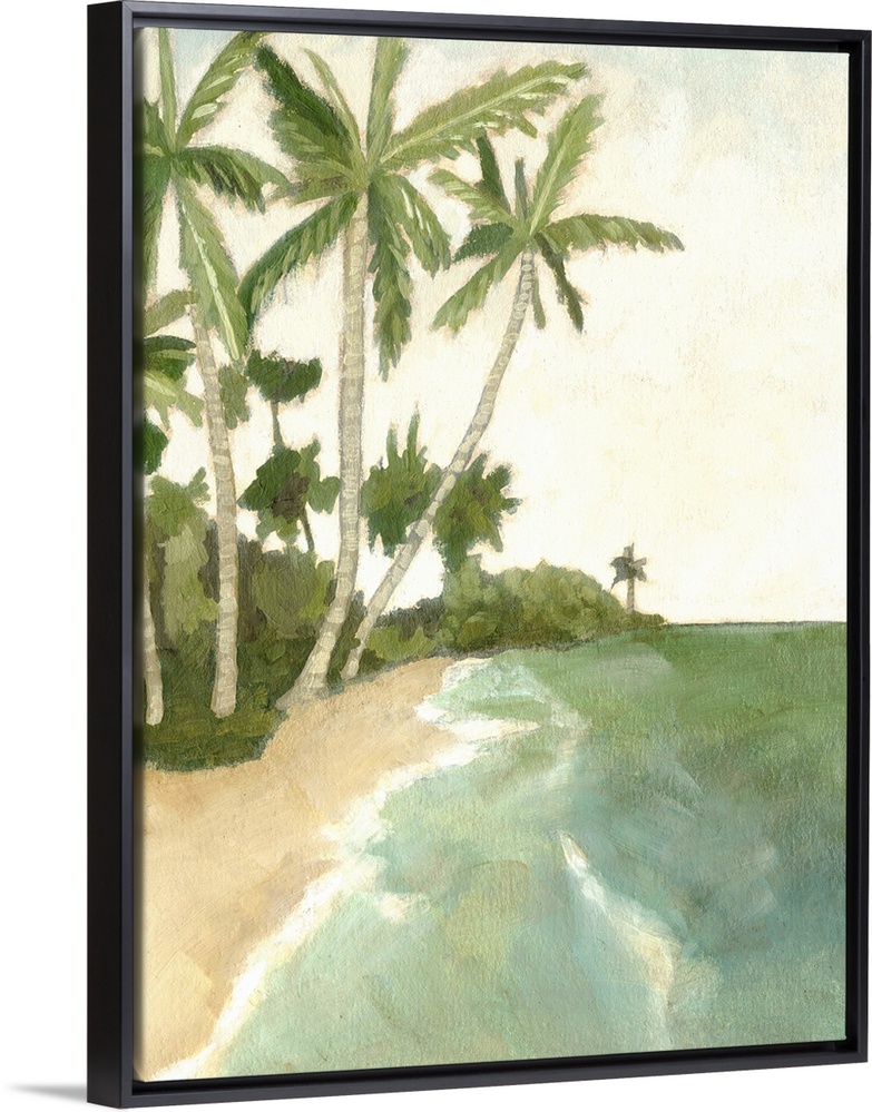 <p>Contemporary artwork of a tropical beach with palm trees hanging over a tranquil coastline.</p>