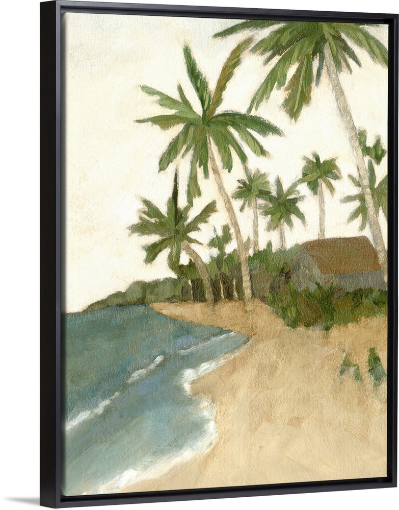 <p>Contemporary artwork of a tropical beach with palm trees hanging over a tranquil coastline.</p>