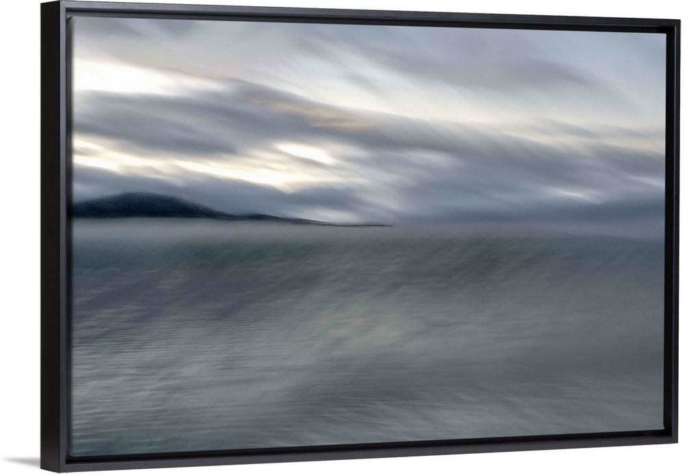 <p>Blurred image of a lake with stormy skies above and a mountain in the distance.</p>