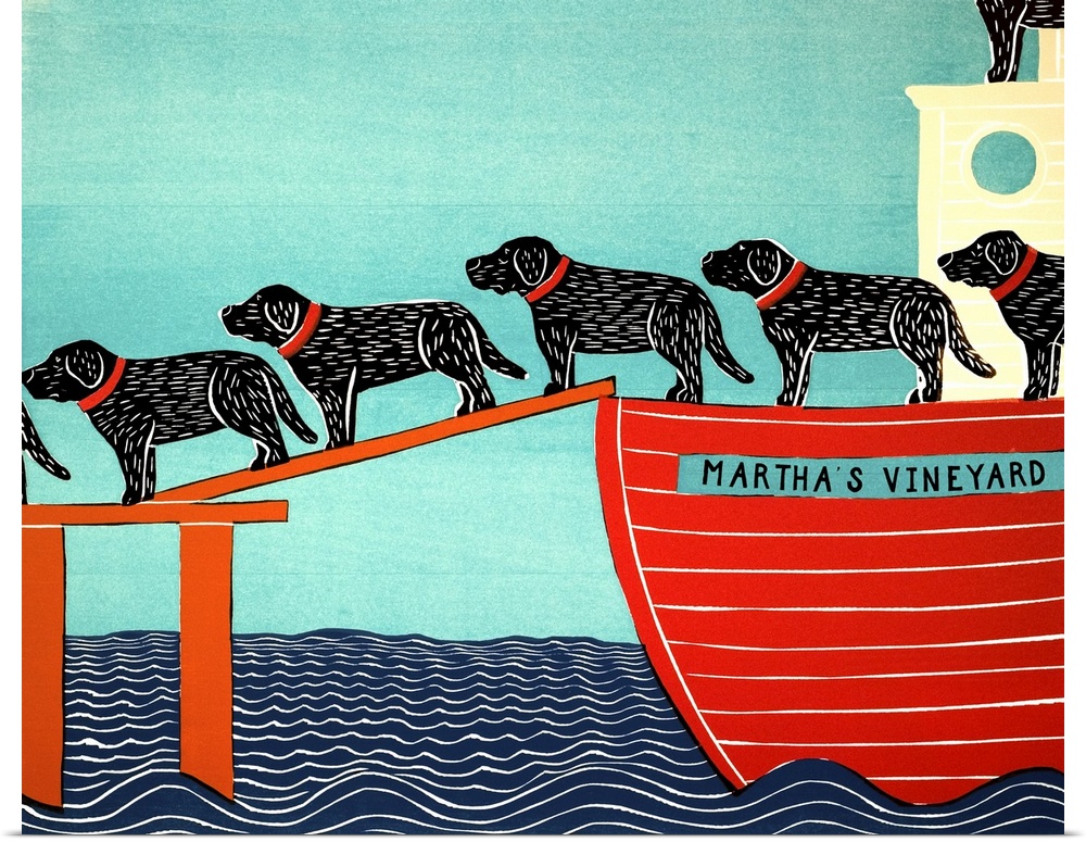 <p>Illustration of a pattern of black and chocolate labs walking off of a Martha's Vineyard ferry.</p>