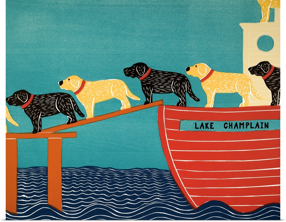 <p>Illustration of a pattern of black and chocolate labs walking off of a Lake Champlain ferry.</p>