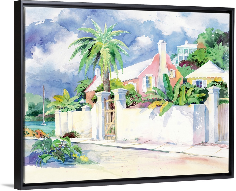 <p>Contemporary painting of a house on an island with stone walls and palm trees.</p>
