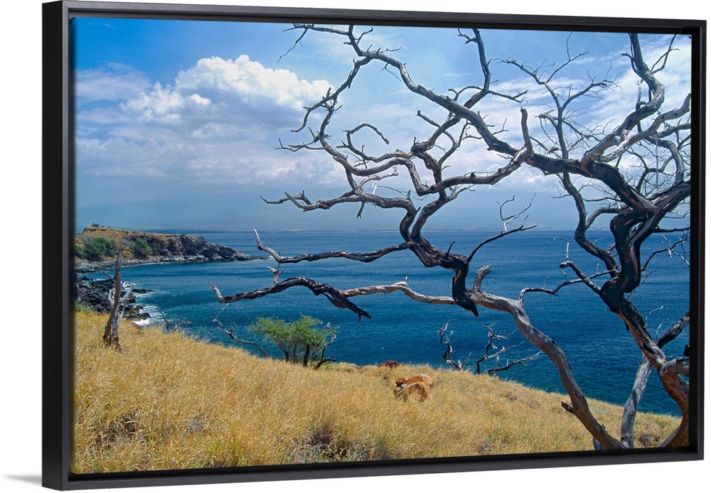 <p>Landscape photograph on a big wall hanging of dried out tree branches overlooking Papawai Point, where blue waters meet a grassy shoreline, in West Maui, Hawaii.</p>