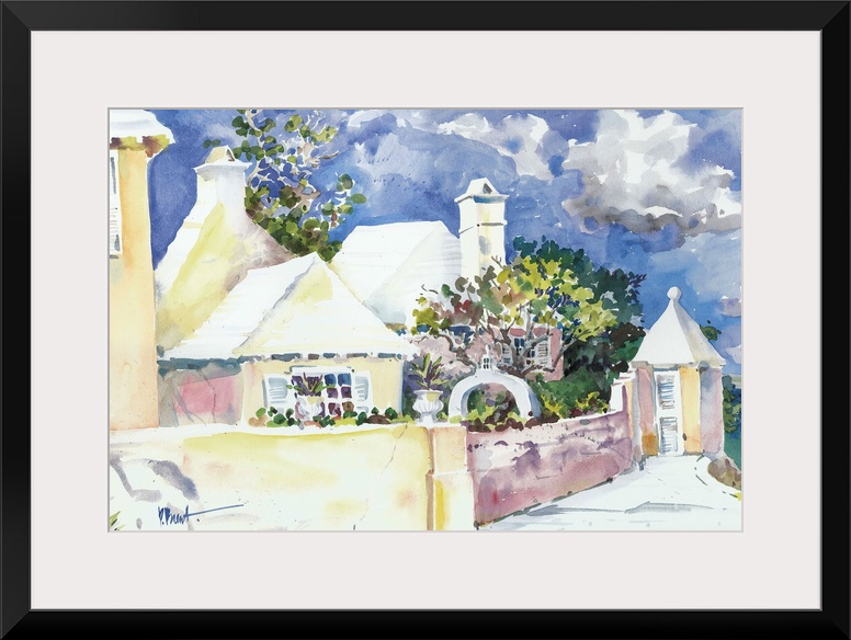 <p>Contemporary painting of a tropical community with stone walls and palm trees.</p>