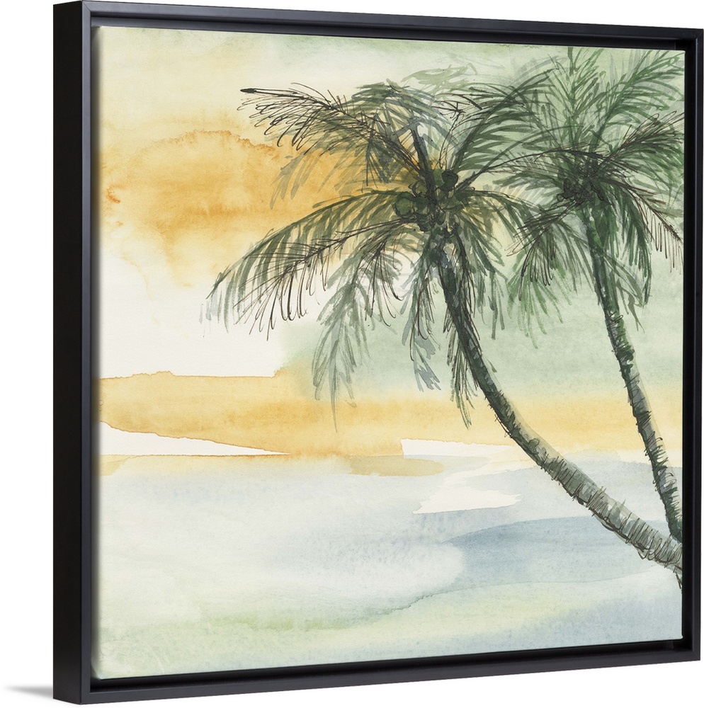 <p>Contemporary watercolor painting of palm trees against a tropical colored background.</p>
