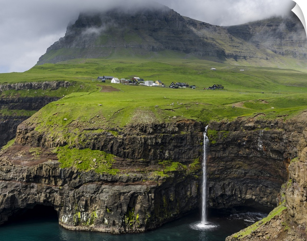 <p>The waterfall near Gasadalur, one of the landmarks of Faroe Islands. The island Vagar, part of the Faroe Islands in the North Atlantic. Europe, Northern Europe, Denmark, Faroe Islands.</p>