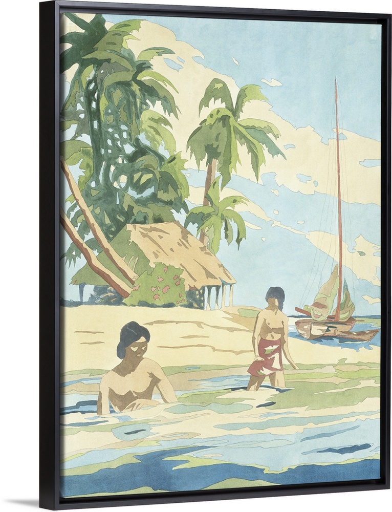 <p>Artwork of Polynesian islanders on the beach with traditional homes and boats.</p>