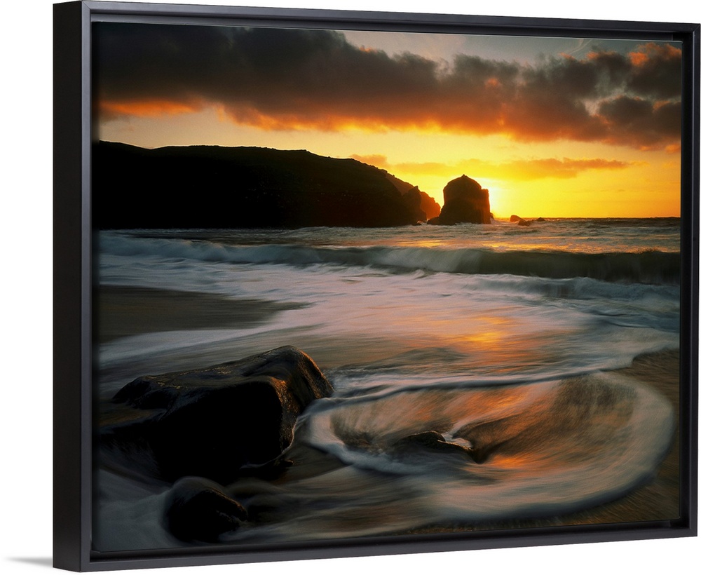 <p>Beautiful time lapsed photography wall art of waves on the beach at sunset.</p>
