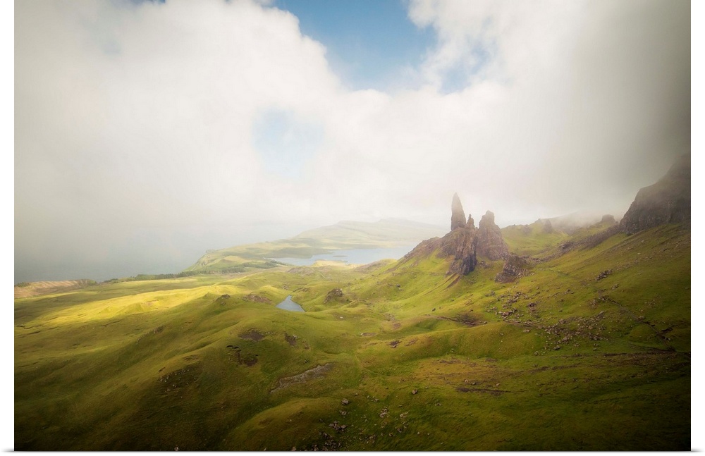 <p>Old Man of Storr peaks moutains on Trotternish Peninsula, Isle of Skye, Scotland, with clouds shadows on the green valley</p>
