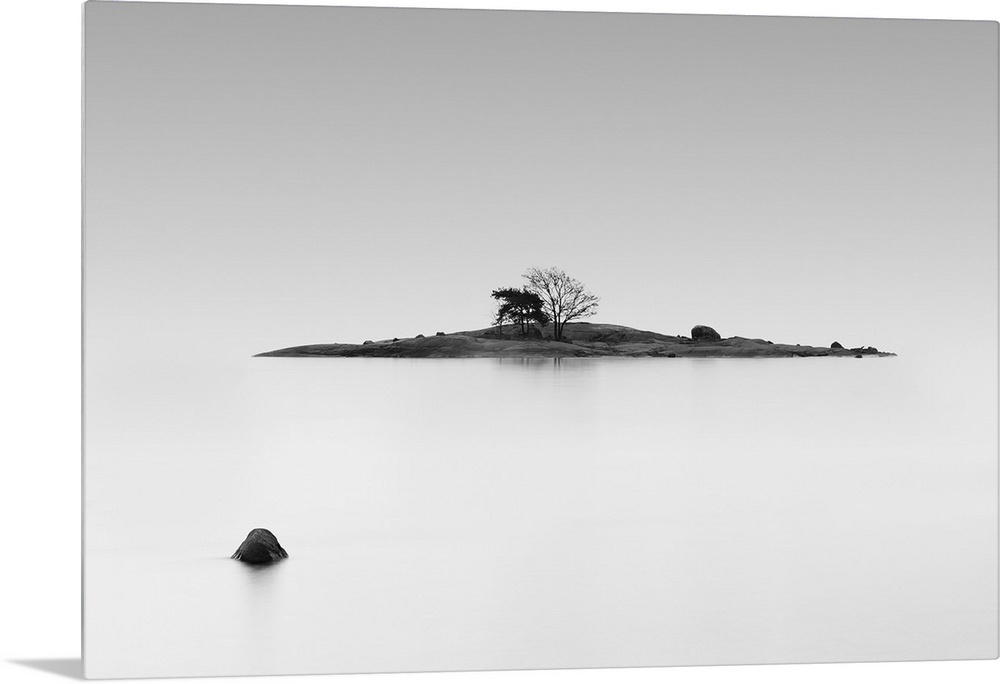 <p>Black and white photo of a small island in the middle of still water, Finland.</p>