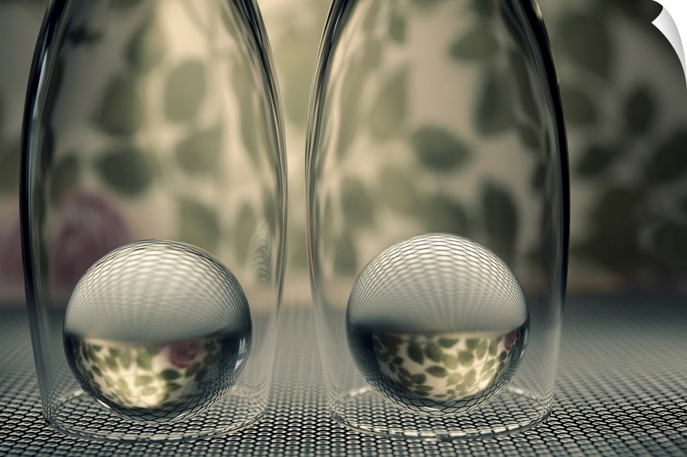 <p>Two glass marbles underneath champagne flutes reflecting the bottom surface and background onto them.</p>