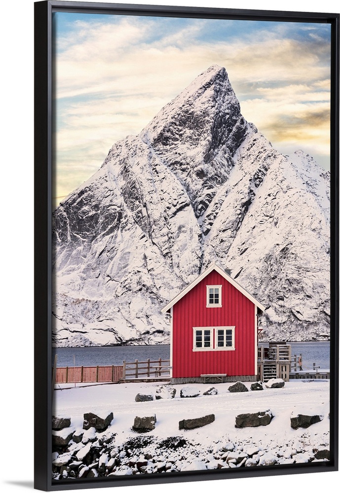 <p>Isolated red fisherman cabin with snowcapped mountain on background at sunset, Sakrisoy, Reine, Lofoten Islands, Norway</p>