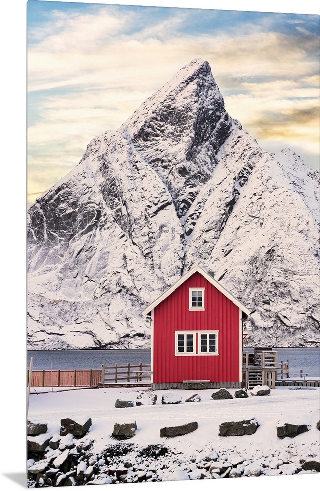 <p>Isolated red fisherman cabin with snowcapped mountain on background at sunset, Sakrisoy, Reine, Lofoten Islands, Norway</p>