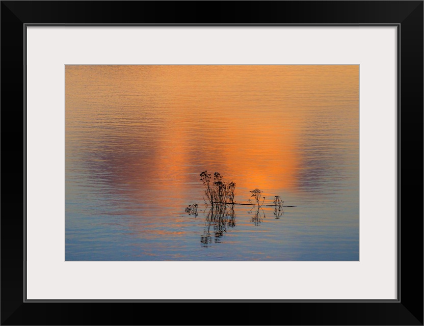 <p>Fine art photo of a small group of silhouetted reeds in a lake at sunset.</p>