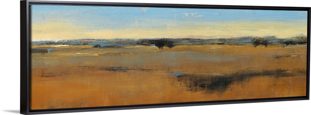 <p>Big horizontal painting of a vast, golden filed with several small trees, beneath a clear sky as the sun sets. Painted with rough, streaking brushstrokes.</p>