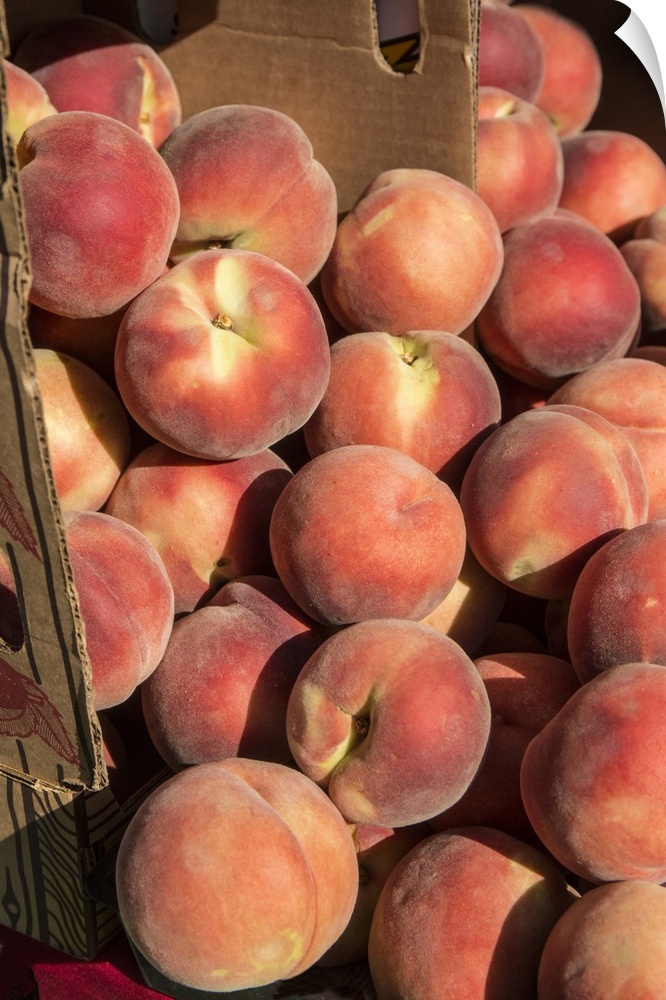 <p>Issaquah, Washington State, USA. Boxes of White Lady peaches for sale at a Farmers Market. United States, Washington State.</p>