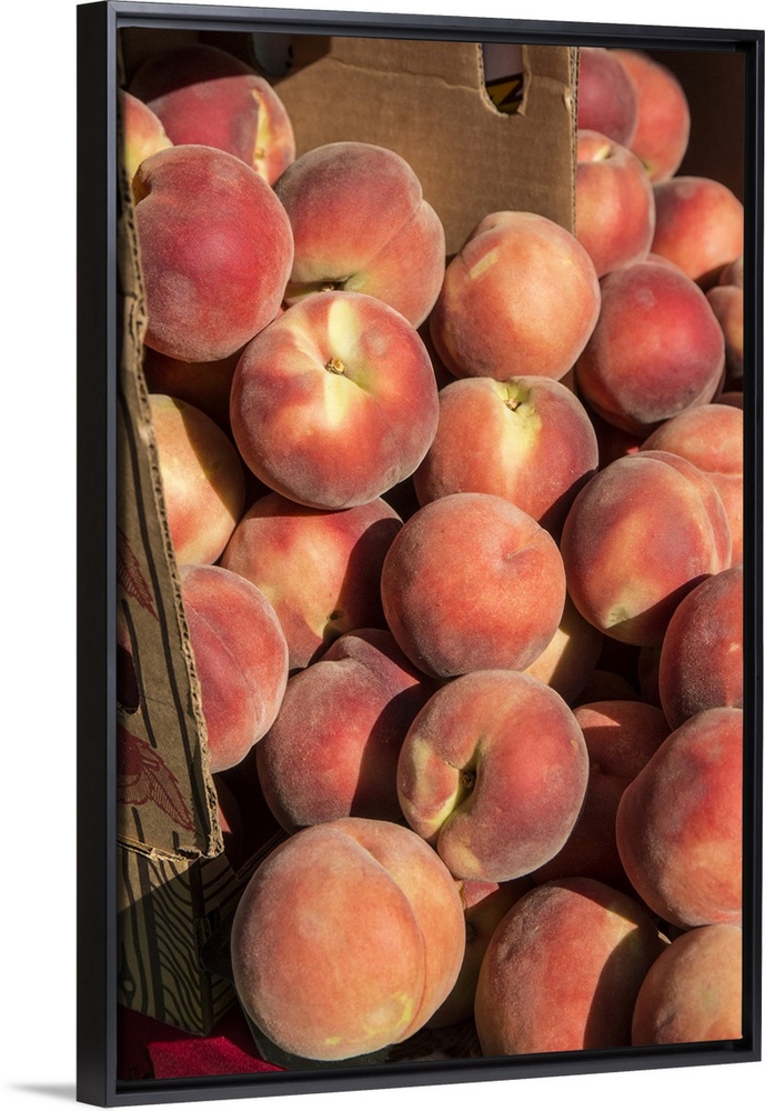 <p>Issaquah, Washington State, USA. Boxes of White Lady peaches for sale at a Farmers Market. United States, Washington State.</p>