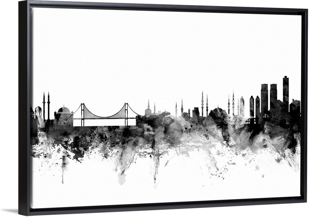 <p>Contemporary artwork of the Istanbul city skyline in black watercolor paint splashes.</p>