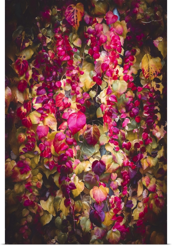 <p>Vibrant foliage in a kaleidoscope of colors, including shades of pink, purple, and green, creates a lush, cascading effect. The play of light and shadow enhances the depth and richness of the leaves, suggesting a sense of movement and life.</p>