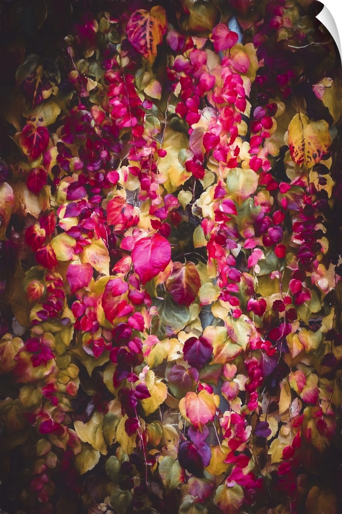 <p>Vibrant foliage in a kaleidoscope of colors, including shades of pink, purple, and green, creates a lush, cascading effect. The play of light and shadow enhances the depth and richness of the leaves, suggesting a sense of movement and life.</p>