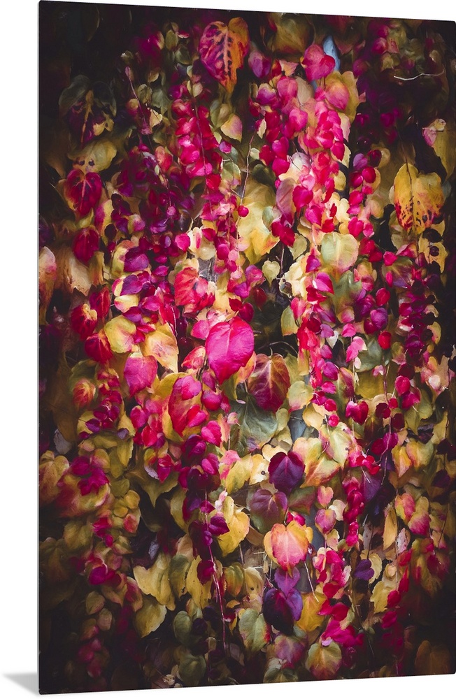 <p>Vibrant foliage in a kaleidoscope of colors, including shades of pink, purple, and green, creates a lush, cascading effect. The play of light and shadow enhances the depth and richness of the leaves, suggesting a sense of movement and life.</p>