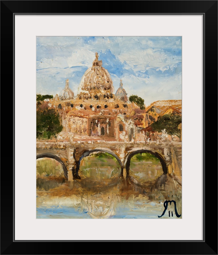 <p>Contemporary painting of an Italian cityscape with dome topped buildings in the background and a bridge over water in the foreground.</p>