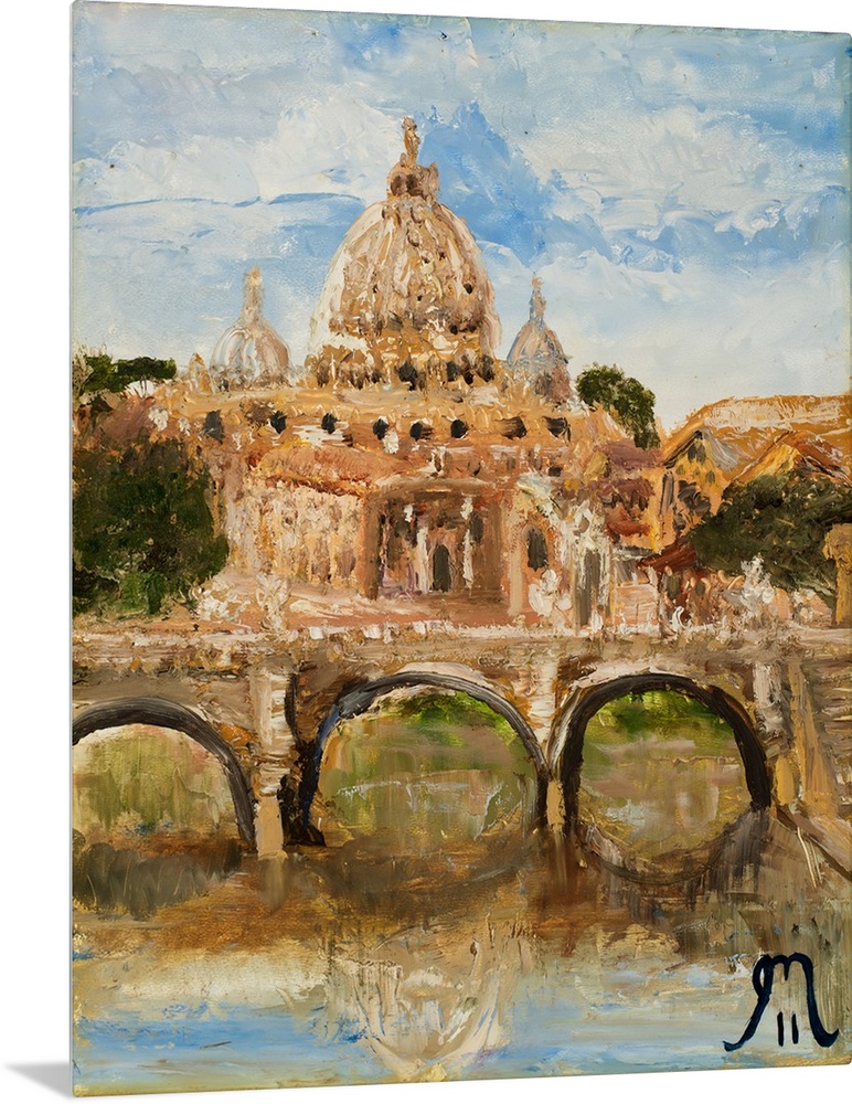<p>Contemporary painting of an Italian cityscape with dome topped buildings in the background and a bridge over water in the foreground.</p>
