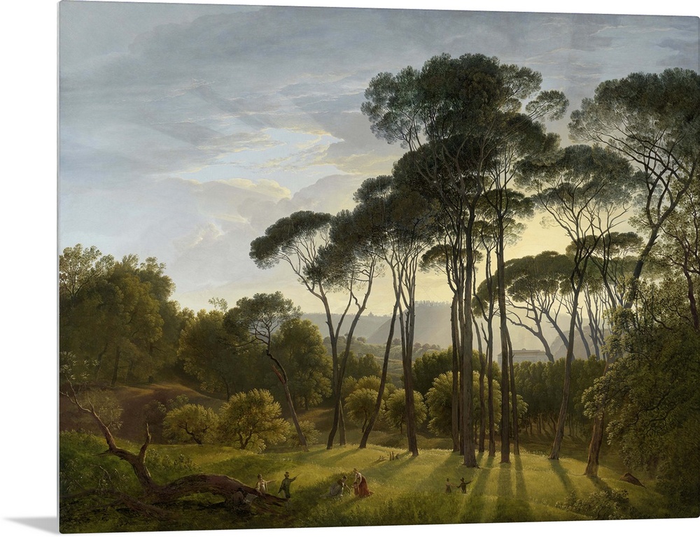 <p>Italian Landscape with Umbrella Pines, by Hendrik Voogd, 1805, Dutch painting, oil on canvas. The sun casts long shadows, and the trees stand out sharply against the sky in the Gardens of the Villa Borghese in Rome. Strolling figures and a working artist are in the foreground.</p>