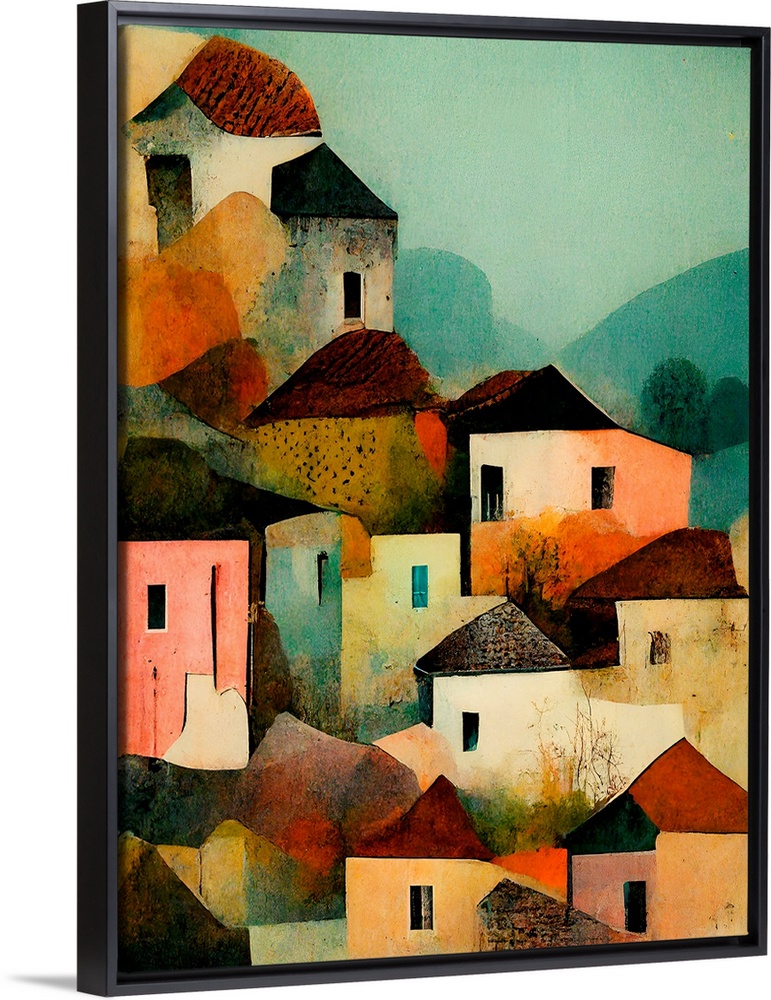<p>A modern painting of a group of small houses clustered on a hillside, in warm tones of peach and teal.</p>