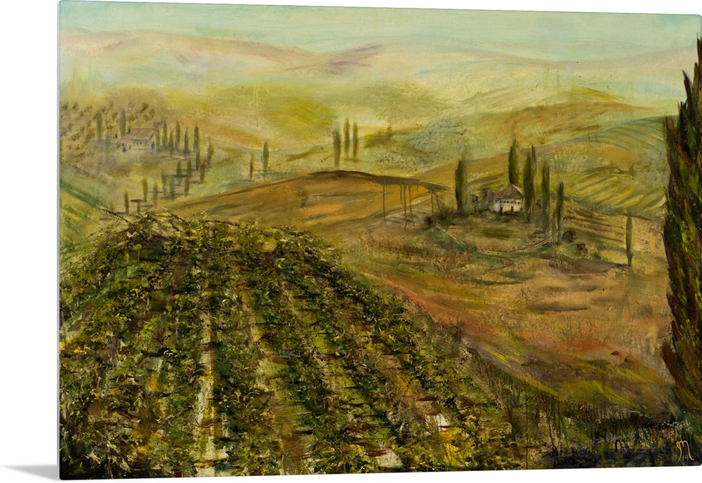<p>Contemporary landscape painting of an Italian vineyard with green and yellow tones.</p>