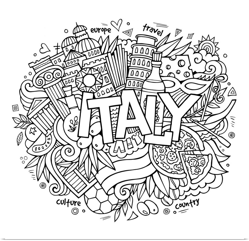 <p>An assortment of Italian-themed objects, such as the Leaning Tower of Pisa and olives.</p>