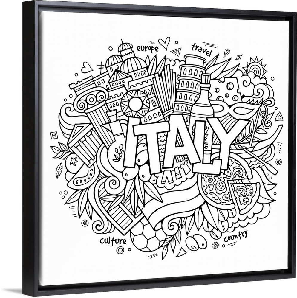<p>An assortment of Italian-themed objects, such as the Leaning Tower of Pisa and olives.</p>