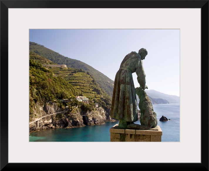 <p>Europe, Italy, Cinque Terre, Monterosso. A statue of St. Francis of Assisi petting a dog and looking out over the sea.</p>