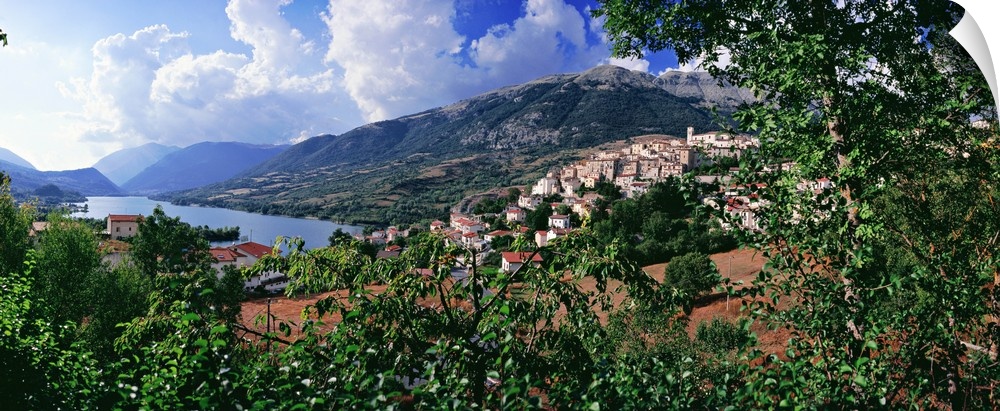 <p>Italy, Abruzzo, Abruzzi, Abruzzo National Park, Barrea, View of town and lake</p>
