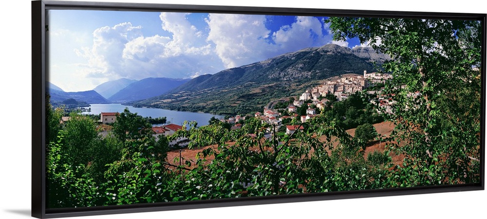 <p>Italy, Abruzzo, Abruzzi, Abruzzo National Park, Barrea, View of town and lake</p>