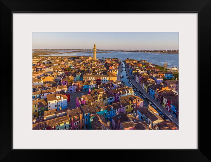 <p>Italy, Veneto, Venezia district, Venetian Lagoon, Adriatic Coast, Venice, Burano, Aerial view of the colorful city of Burano at sunset with the leaning tower of the church of San Martino Vescovo.</p>