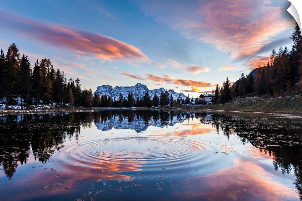 <p>Italy, Veneto, Alps, Dolomites, Belluno district, Cadore, Auronzo di Cadore, Autumn sunset at Antorno Lake with a circle of water, clouds and mountains reflex on National Park of Tre Cime di Lavaredo, Drei Zinnen.</p>